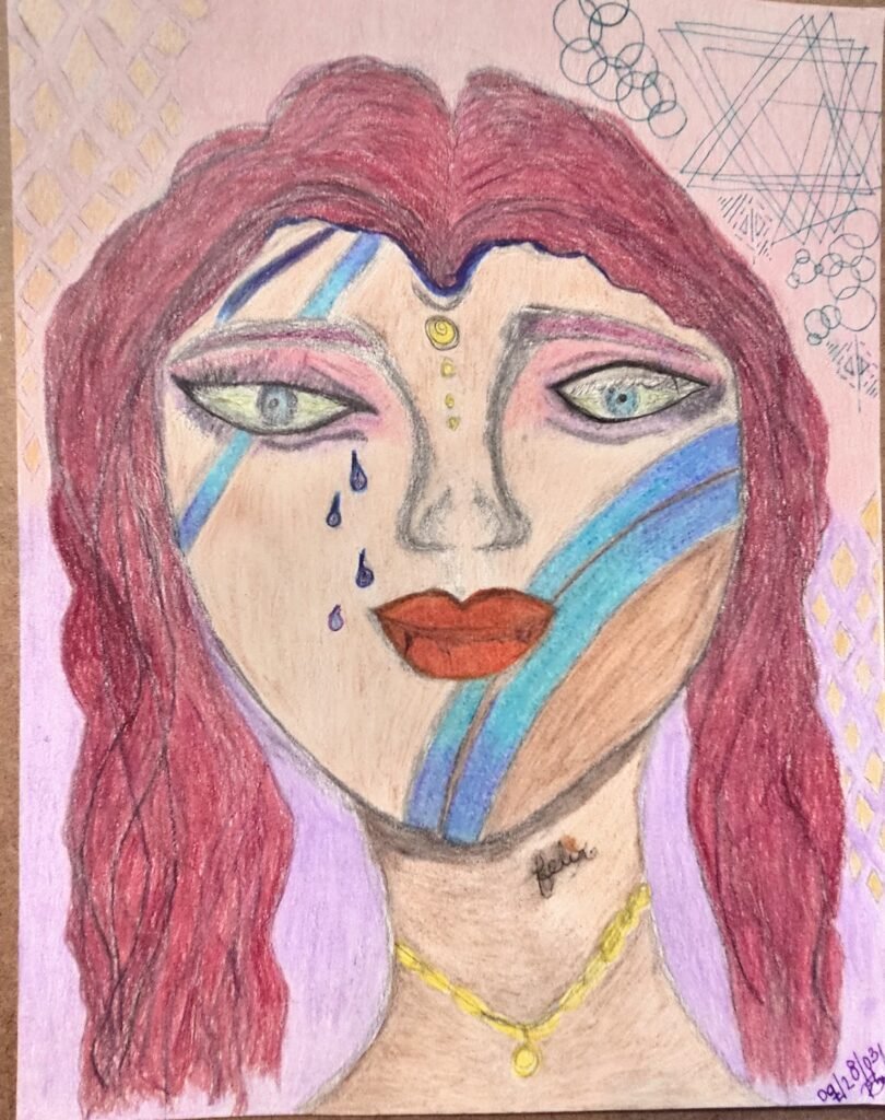 Materials Used: 8X10 Cream Cardstock Prismacolor “Under The Sea” 12ct Set Crayola “Colors Of The World” 24ct Set Crayola 100ct Set Kalour 300pcs Premium Color Pencil Set Gamsol Prismacolor Colorless Blender Prismacolor 18ct Premier Graphite Drawing Set UB-157 Rollerball Pens 0.7mm Nib Purple & Green Ink Faber Castell Dustfree Eraser Blick’s Kneaded Eraser